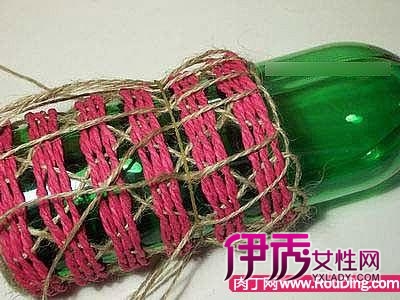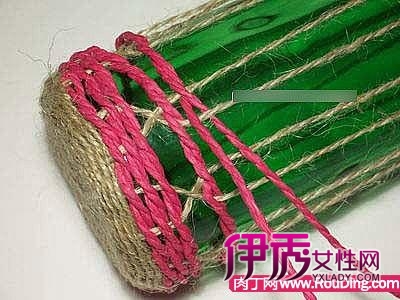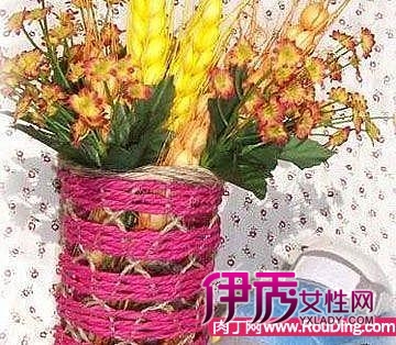 16、这样反复编几次,一直编到所有的线头都藏进去为止。编完后整理一下,拿掉瓶子,再插上相配的花,就是一个漂亮的花瓶了!