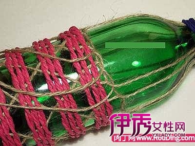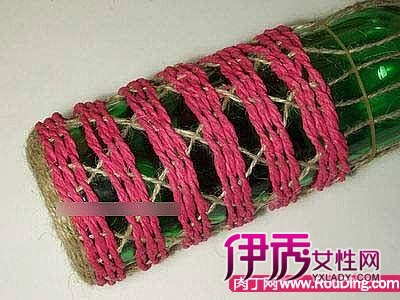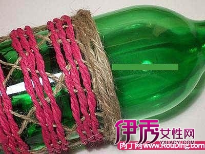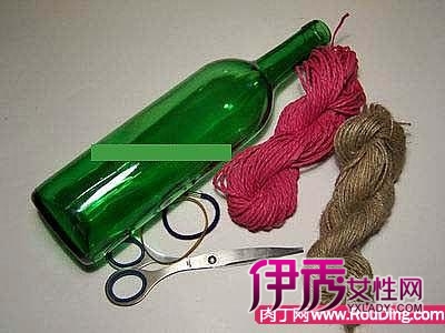 制作材料:玻璃瓶一个;麻绳约10米;纸藤约15米;剪刀;皮筋两个。