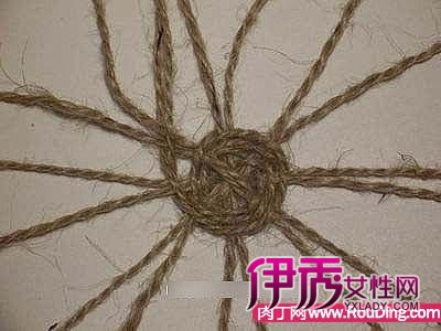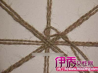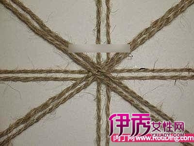 1、麻绳剪成80cm长短,准备八根,两根并一股成米字形交叉摆放。