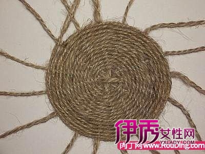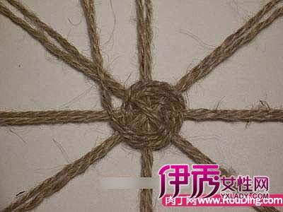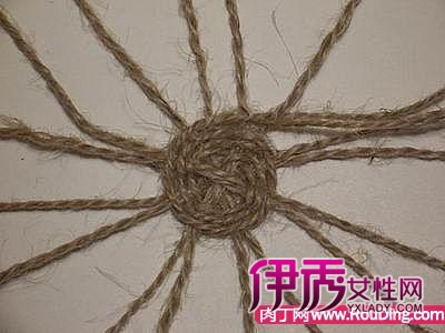 2、另剪一段3米长的麻绳,对折后套入其中一股,开始绕中心交错编织。