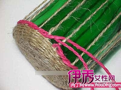 7、把圆形对齐瓶底,用皮筋固定其余的16根麻绳,然后把线头藏好。