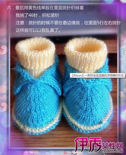 第六步:最后用黄色线单股在里面挑针织袜套;挑46针,织松紧针(注意:挑针的时候不要再最边缘挑,往里面5行左右挑针就可以以假乱真了。)