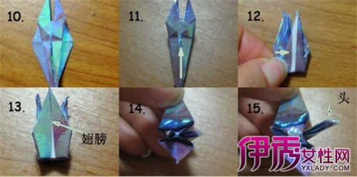 14:13中所指的即千纸鹤的翅膀,两只手各揪住一个翅膀向两边拉开,中间就会鼓起来如15图中所示的身体部位了