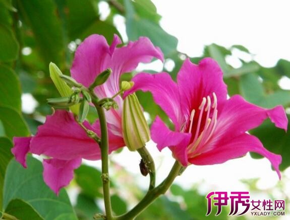 红花羊蹄角木(学名:Bauhinia blakeana Dunn):常绿乔木,树高6-10米。叶革质,圆形或阔心形,长10-13厘米,宽略超过长,顶端二裂,状如羊蹄,裂片约为全长的1/3,裂片端圆钝。 总状花序或有时分枝而呈圆锥花序状;红色或红紫色;花大如掌,10-12厘米;花瓣5,其中4瓣分列两侧,两两相对,而另一瓣则翘首于上方,形如兰花状;花香,有近似兰花的清香,故又被称为“兰花树”。花期十一月至翌年四月。花大如掌,略带芳香,五片花瓣均匀地轮生排列,红色或粉红色,十分美观。