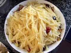 3.再放入土豆丝和干辣椒,旺火炒5分钟