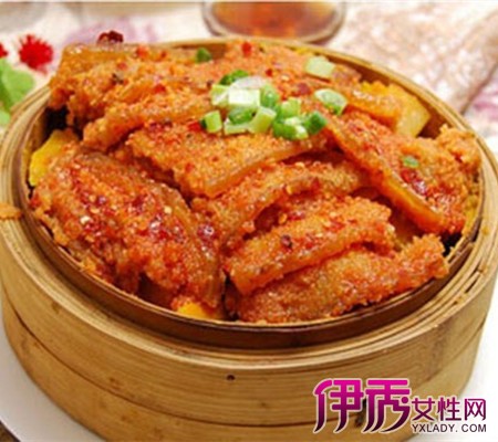 附: 猪肉要新鲜,一定要收拾干净;拌猪肉时可加入少许腐乳和腐乳汁;蒸猪肉用的碗 ,以能码下所有的猪肉片为好,成菜后才好看。
