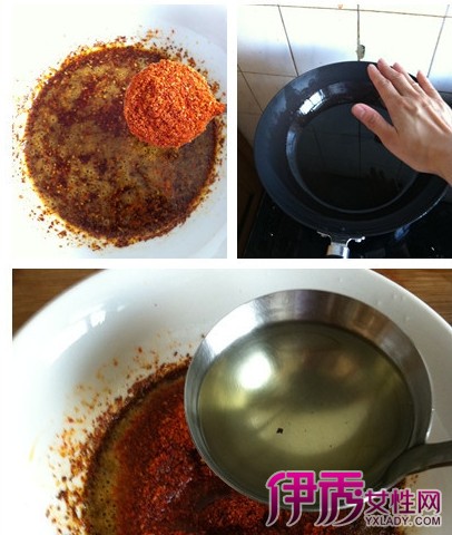 3、在碗中加入另1/3的辣椒面;等1-2分钟后,油温降一些,大概五六成热,用手在锅上感觉只有些烤手时,用勺子再舀出1/3的油,浇入碗中。