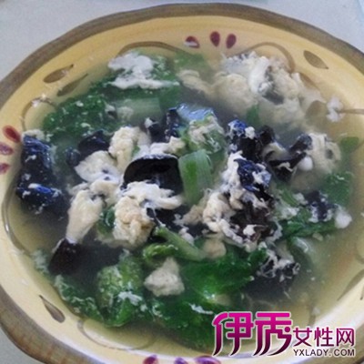 5、当蛋质松软时,用手勺将鸡蛋捣散,加入鲜汤1000克,再下精盐、木耳、菜心(油菜心)、味精烧开;