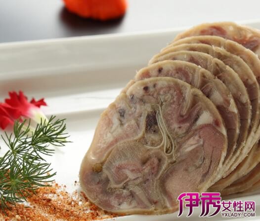 第二步:锅内倒入凉水(水量要漫过羊头9厘米),在旺火上烧沸,将洗净的羊头逐个放入锅中,煮1个多小时,达到七成熟时(用手按一下羊脸上的肉,如已由原来的硬挺变得稍有弹性,或者按下耳朵根部,已由硬变软即可),取出趁热称拆下颅骨。拆法是:从头皮正中的划口处,将头肉扒向两边(头肉须连着脸肉,不要撕断),露出颅骨,再一手掐住两肋,一手从鼻骨处将颅骨往一掀即取下,将颅骨上的羊眼睛用手捅出,再将颅骨砍开,取出羊脑。然后从羊头肉上切下两耳(挖去目膜不要)和口腔上膛的软骨(长有一道道的横纹,俗称天梯),削去嘴岔上的毛根,片去沿不整齐的肉。再贴着舌(俗称口条),两侧顺长各一刀,将下腭骨切断,完整地拆下两块带羊肉的羊脸子及整条羊舌(每个羊头约出熟肉1千克),在凉开水中浸泡1小时,以使肉质脆嫩,色白,切好。