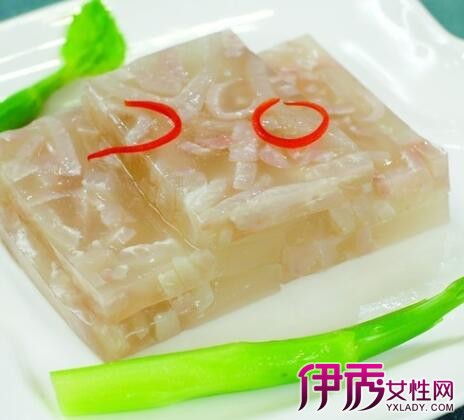 这是一款绝对不含脂肪的皮冻,怕胖的MM应该会喜欢。原料是半斤鱼膘,为了去腥,可多加一些姜、蒜,也可以加入一些豆蔻、草果等香料。除了盐,一定要记得加一点糖和酱油,味道会更好哦!