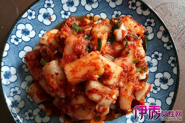 韩式腌萝卜是一道美味的菜肴,萝卜加上各种调味料腌制,口感酸爽清脆,适合下饭。材料:白萝卜1根,盐少许,葱适量,姜1小块,蒜4瓣,韩式辣椒酱适量,白糖适量,梨丝适量,辣椒粉适量,鱼露2小匙。做法一:白萝卜洗净、去皮,切成1厘米见方的小块,放入容器中,加入少许的盐搅拌均匀,然后腌渍出水使萝卜丁软化,把腌出的水倒掉,再用清水洗去盐分,沥干。腌渍的时间大概为1个小时左右。当成简单的凉拌菜吃,也可不必腌渍这么久,只要萝卜腌出水就可以了。盐不要放太多,免得咸得发苦。小葱切段;姜和蒜也要切碎。这时萝卜和腌渍的调料都已经准备好了,只需将它们混合就可以了,将腌渍好的白萝卜加入调料搅拌均匀,放到保鲜盒中,再放到冰箱里冷藏3天就可以吃了,夏天的话,放入冰箱腌渍2个小时也就可以吃了。