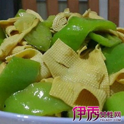 3、锅烧热油,下葱花、干椒丝略炒,放入豆腐皮,加蚝油、酱油、味精等调料炒匀,淋花椒油,出锅即成。