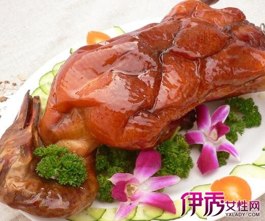 1. 将鸭宰杀,洗净,翅膀并起,左手拇指和食指攥住鸭膀根部,鸭背靠近手背,小指勾住鸭右腿,右手捏住鸭嘴巴,把鸭头送给攥鸭膀根的拇指和食指,捏在鸭头和颈部之间,用刀在脖外切一小口,以切断气管为准,随即用右手捏住鸭嘴,把脖颈拉成上下斜直,血滴于碗内;