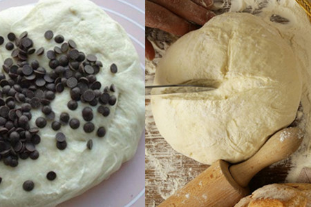 将准备好的面团和麻薯分成大小相等的面团,将面团中加入巧克力和麻薯,并且在面团中包裹住核桃等坚果。将面团封口,并且在面包表面切开口子,这是为了面包在烤制过程中更加入味。