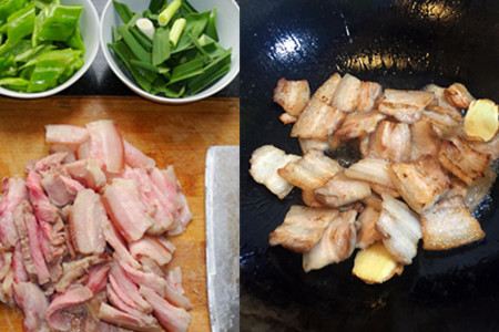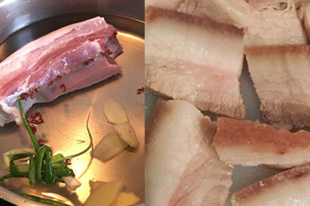 我们在做菜的时候需要用心挑选食材,回锅肉需要肉质本身含有一定的油脂,所以我们可以买一些上好的五花肉来做这道菜。五花肉买回来之后不要直接切,我们需要放在锅里,加一些精盐、五香粉和葱段一起煮,等到烧开之后,焖几分钟之后再翻个面接着煮。煮熟放凉后用刀切成薄片备用,切一些蒜苗,然后锅底倒入少量食用油,加热至五层左右。