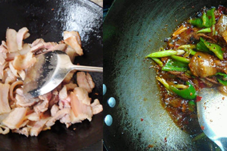 等到油温足够的时候,把五花肉放进去翻炒,慢慢就会把油脂煸炒出来,所以我们不需要放太多油。炒四五分钟后,我们先把肉拿出来,然后锅底留油,把辣椒和豆瓣酱放进去翻炒至香味飘出来。回锅肉就是要把肉炒两遍,所以等酱炒熟后,我们把拿出来的肉片再倒进锅里,注意火候,可以适量的添一点儿水。
