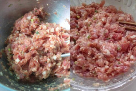 然后我们将葱姜蒜末加入猪肉中,注意加入的葱姜蒜不要太多,不然做好的包子一口咬下去都是葱姜蒜,这样会影响包子得口感。再加入香油、酱油、盐、味精、油和少量的水,将它们搅拌均匀,建议大家在搅拌的时候往同一个方向搅拌,这样会将猪肉和调料搅拌得更加的均匀。在将猪肉馅做好之后,我们将猪肉馅放进包子皮中。