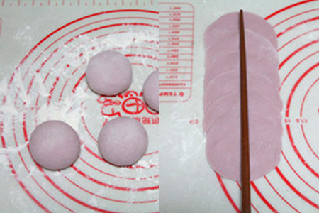 10.将6个稍大的面团用擀面杖擀成圆形片状,并交叠在一起,用筷子在中间位置压一下。