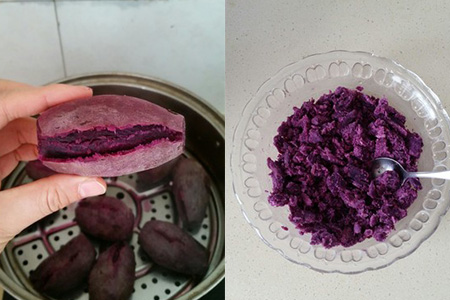 2.将紫薯洗净后,上锅蒸熟,约15分钟。