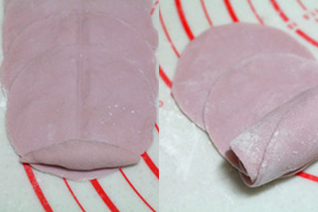 11.将剩下的小面团搓成锥形,放在第一片上,包裹着锥形的面团,将面片从下往上卷起后,从中间为止切开,一分为二。