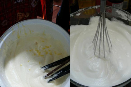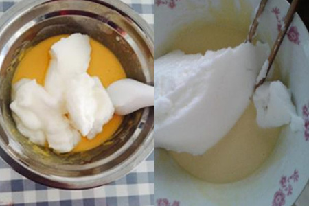 第三步:将一半搅打好的蛋白与蛋黄翻拌均匀,注意不能搅拌,而是小心地上下翻拌。然后再将剩余的倒入并翻拌。