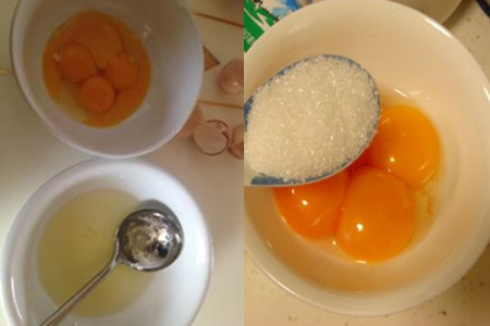 第一步:将4个鸡蛋的蛋黄蛋清分开,分别装到两个小盆里备用,并将1/3的白糖与蛋黄搅拌均匀。