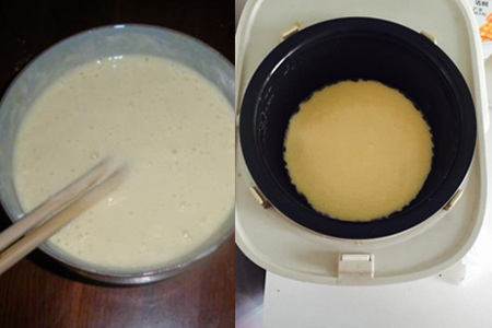 最后一步:在电饭煲的锅底和四周涂一层食用油防止粘锅,预热5分钟左右将混合物倒入并按煮饭加热档。几分钟后电饭煲会跳到保温档,然后再来一次加热,3至4次之后,香喷喷的蛋糕就做好了。