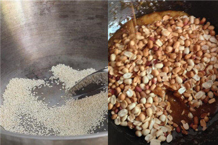 等待锅里面的冰糖已经完全融化了之后,我们就可以把刚刚的花生倒入锅里面,这个时候我们要用锅铲快速的翻炒,不然花生和冰糖不能够完全均匀的结合在一起,然后再倒入刚刚已经炒熟了的芝麻,把它搅拌均匀就可以了。