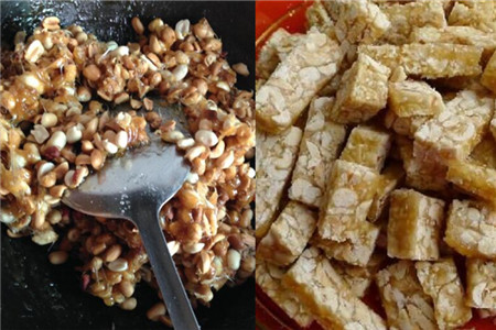 把花生和芝麻都倒在锅里面了之后,火不要开得太大,因为锅里面的水分非常的少,这样很容易让里面的冰糖快速的蒸发掉,导致锅里面的花生变糊。我们需要让冰糖和花生在锅里面变冷凝固了之后再倒出来,然后把它切成块就可以吃了。
