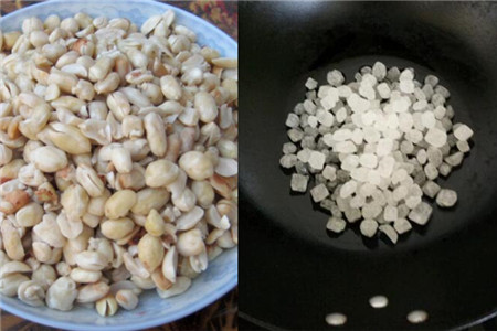 做花生糖除了要准备大量的花生以外我们还要准备很多的冰糖,因为只有冰糖才可以让花生凝固在一起,很多人都觉得白糖其实也可以,但如果我们使用白糖的话,其实这样做出来的花生糖没有冰糖做出来的花生糖更加的好吃。