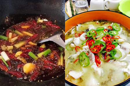 第三, 炒锅入油,大火烧开,下葱姜蒜和泡椒爆香,然后下酸菜翻炒,待到翻炒均匀后下鱼头鱼尾一同炒制;炒好后,下清水煮鱼汤约20min,然后下鱼片焯熟,七分熟即可盛起。