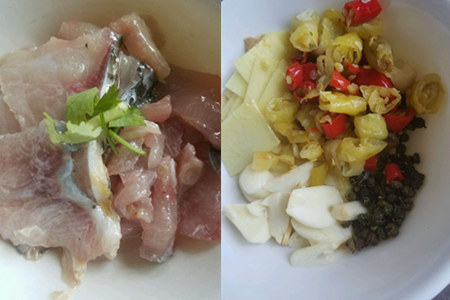 第二, 浸泡好的鱼肉置于干净的容器里,调入盐、白胡椒、淀粉和蛋清进行腌制;另一边,将辅料泡椒、辣椒、笋子、酸菜切丁备用。