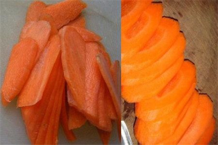 胡萝卜洗好后先把它切成片,切片时刀要斜着切,不然切出来的片太小之后不容易切丝,也不要切得太厚;把胡萝卜全部切成胡萝卜片后,将它们整齐的摆好。