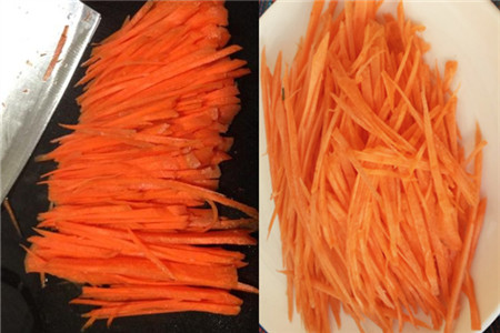 接下来我们顺着摆好的胡萝卜片开始切丝,切丝时也像切片那样斜着切,尽量把丝切细一点这样看起来才会更加美观,大家要注意不要切到手指母,就这样慢慢地重复切,一盘胡萝卜丝就切好了。