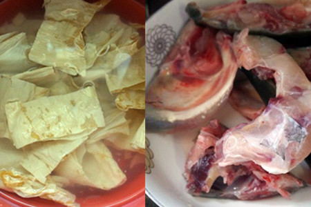支竹放入清水中泡软,再用剪刀剪成小块。鱼头清洗干净,斩成小块待用。准备些姜片。
