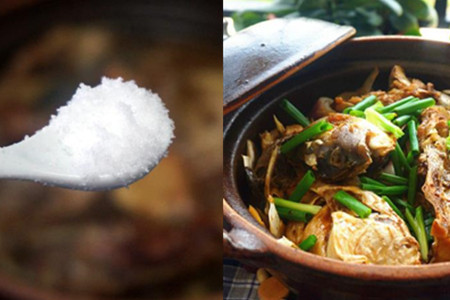 10分钟后,开盖,调入1勺盐和2勺糖。香葱洗净切段,待砂锅中的鱼头熟透后,将葱段放入,加盖即可端上饭桌。