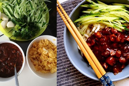 锅内放入四勺油,再把香菇、蒜末放进锅内爆炒半分钟,加入适量的老抽和料酒煮一分钟。后把腌制后的牛油放进去翻炒,直至牛肉变色,再倒入辣椒酱和豆瓣酱翻炒两分钟,出锅前把已经煎熟的蛋放到牛肉酱上面焖三十秒即可。把面煮熟沥干水分后,浇上牛肉香菇滑蛋酱,然后再放入黄瓜丝搅拌。这味道简直就是完美。