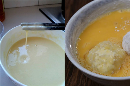 第三步:我们开始调制裹在鸡蛋外面的淀粉,拿出一个空碗在里面放入适量的面粉和一个鸡蛋,然后往里面加入温水开始搅拌,搅拌均匀后再放入少许的盐,继续搅拌,接下来就可以裹鸡蛋了,把鸡蛋一个个的放到调制好的淀粉里面裹一圈。