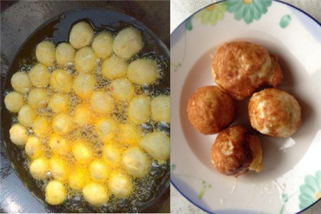 第四步:把裹了淀粉的鸡蛋放到锅中油炸,锅里一定要多倒一点油不然炸出来的鸡蛋不泡,等到鸡蛋外面的淀粉炸至金黄色就可以用漏勺捞出沥干油放到盘子中。