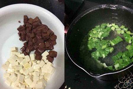 1、朋友们要从市场购买新鲜的豆腐、猪血等。然后将二者清洗干净,并切成丁。完成之后再将猪血和豆腐分别焯水并捞出来放在容器之中。朋友们还要在焯猪血的时候加入一些料酒,这样能让猪血去掉腥味。同时将淀粉加水搅拌好放在一旁备用。