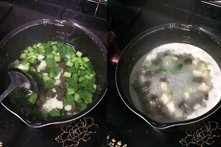 2、在锅中加入一些清水,烧开之后加入切碎的青菜。因为食谱之中有豆腐,因此朋友们尽量不要用菠菜,这两种蔬菜同食可能会让胃部不舒服。煮三分钟之后就可以将豆腐与猪血等一起放入到热锅之中。然后用勺子轻轻地搅动,以免有食材粘在锅底。