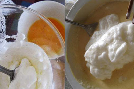 3、将打好的蛋白倒入蛋黄液的时候,搅拌的手法也是非常关键的。朋友们不能用画圈的方式来搅拌,而应该用画十字的方式,不然打发的蛋白很快就会软塌下。这样不管怎么烤,蛋糕都不会发的。