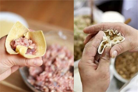 第四步,就可以开始包烧麦了。用左手先拿起一张烧麦皮,用右手拿着勺子挖一坨馅料放到面皮中间,然后左手顺势把烧麦皮捏成一坨,在中间漏出一部分馅料,形成一朵花的形状就可以了。