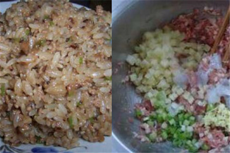 第二步,我们就可以开始制作烧麦馅料,在超市购买猪肉末,把肉末放入大盆中放入适量的盐、鸡精、酱油、糖、料酒等调料,调好猪肉馅料之后就在盆里面加入煮熟的米饭进行搅拌,就用手搅拌均匀,嫌弃的话也可以用筷子搅拌。