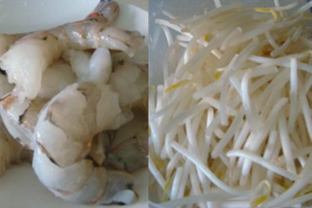 鲜虾去壳和虾线,清洗干净,滤干待用。豆芽清洗干净,滤干待用。