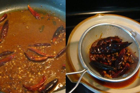 炒锅洗净上灶,放适量油烧热,将干辣椒、胡椒和花椒下锅煸炒。炒出香味后,调入适量辣椒粉和少许油,继续煸炒,炒成红油。将炒好的红油过滤到砂锅,兑入适量清水,加适量盐和鸡精,搅匀,将砂锅置于灶上,开大火煮开。