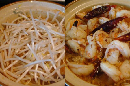 煮开之后,将腌入味的的虾仁放入砂锅,煮熟后捞出待用。接着将豆芽放入砂锅,同时另起锅烧点热油,把煮熟的虾仁铺在豆压上,撒些辣椒碎,再把热油浇在上面即可。