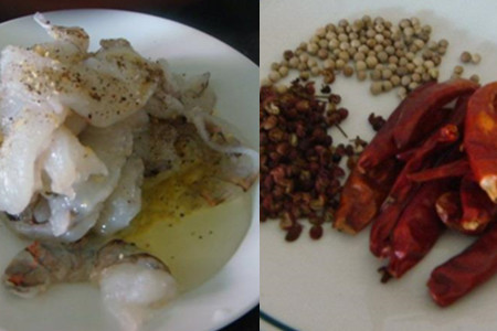 食材:鲜虾400克、豆芽100克、蛋清、干辣椒、辣椒碎、胡椒、花椒、油、盐。