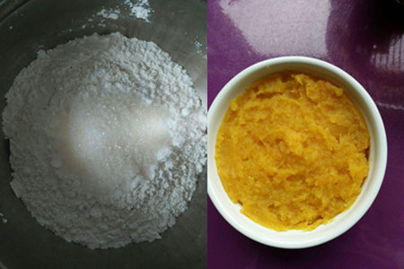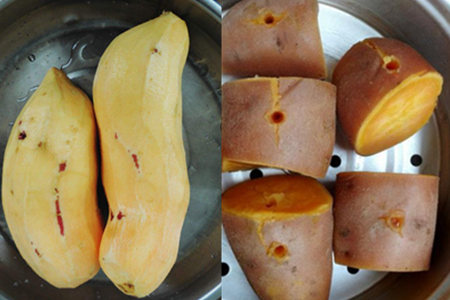 糯米粉要和澄面搅拌均匀,然后隔着水蒸熟。大家尽量用大火,这样大概蒸十五分钟就能完成了。红薯蒸熟之后就用棍子压成泥状,也可以用勺子。