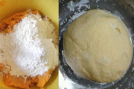 已经捣成泥的红薯和糯米粉以及澄面搅拌均匀,这个时候的粉团会比较容易散开,大家不断揉均匀就可以了。等粉团揉到没有白粉之后,既可以在里面加入白砂糖以及猪油。如果大家不喜欢猪油,也可以换成黄油。